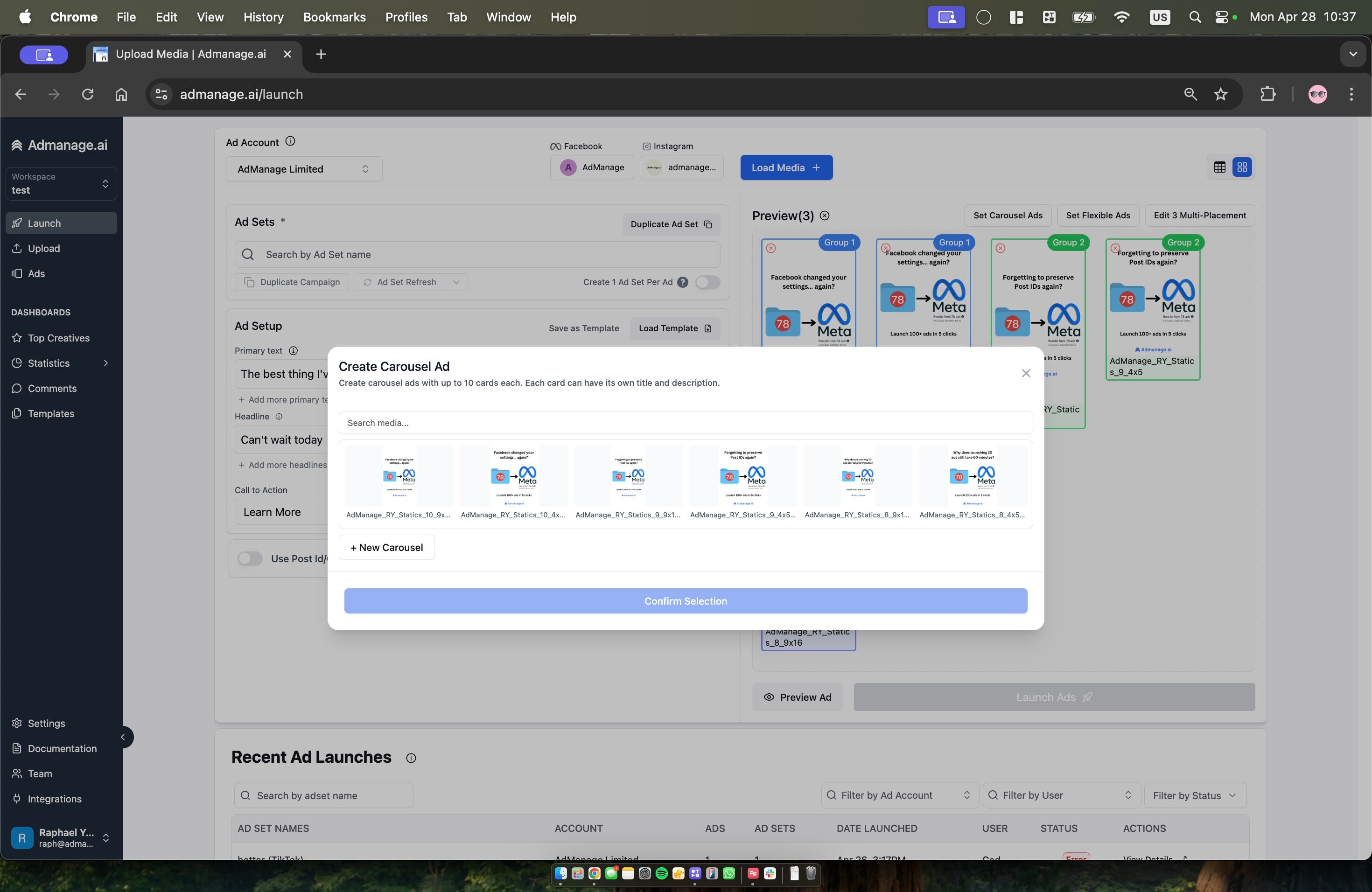 Learn how to create and configure carousel ads in AdManage. This guide covers loading media files, selecting multiple assets, grouping ads together, and managing placement variations for your carousel ads.